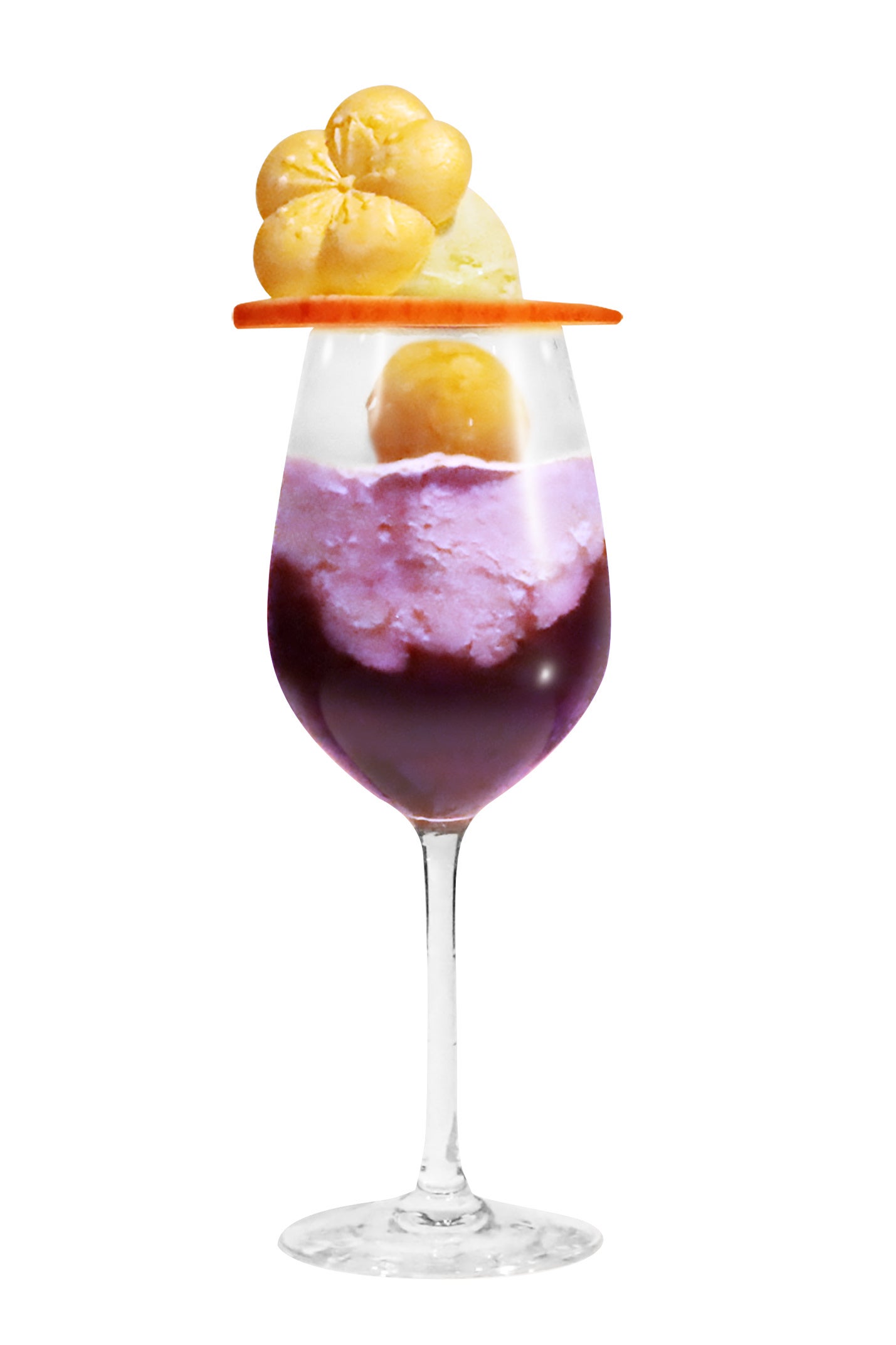 完熟南高梅と葡萄をブレンドしたシロップ層にバタフライピー仕立ての梅ソニックスムージーを重ね完熟南高梅を1粒投入し、焼きりんごスライス、バニラアイス、梅最中を乗せました。