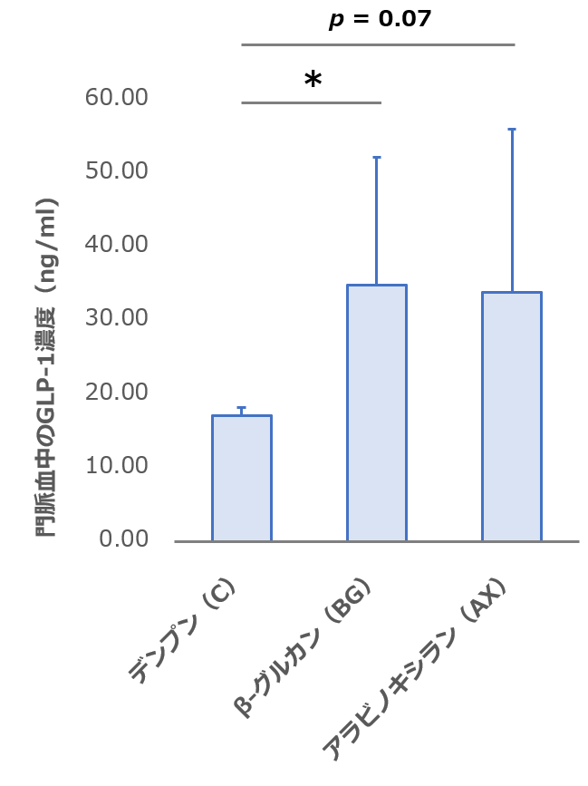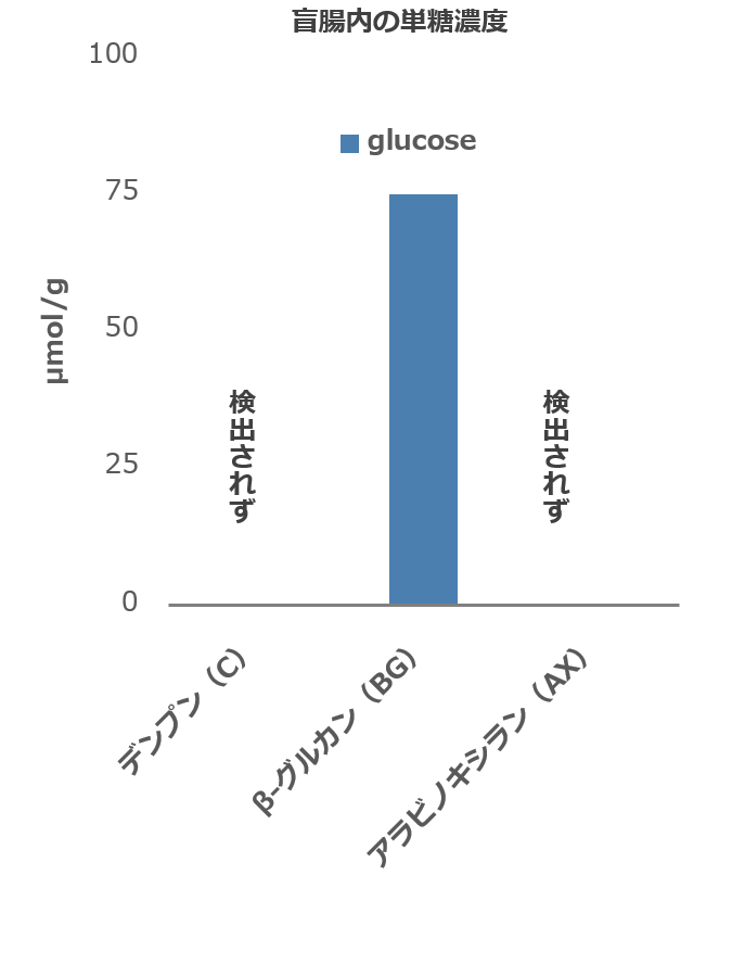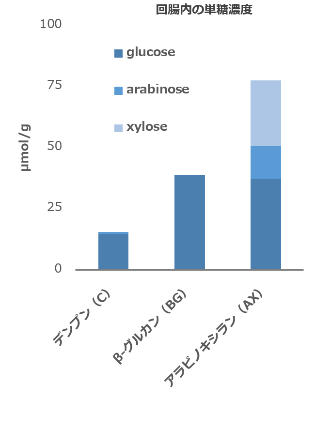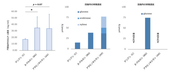 セカンドミール時の門脈血の総GLP-1濃度は、BG群はC群に比べ有意に増加し、AX群でも増加傾向になりました。また盲腸内容物中の酢酸濃度はAXで有意に増加し、酪酸濃度はBG群で増加傾向を示しました。加えて回腸内容物において、C群では飼料由来の未消化のグルコースが残存していましたが、BG群ではグルコースが増加し、未消化のβ-グルカンの分解物によるものと考えられました。AX群ではアラビノキシラン画分であるアラビノースとキシロースが確認されました。盲腸内容物では、BG群でのみグルコースが確認されたことから、β-グルカンの一部は未消化のまま盲腸に到達することが示唆されました。