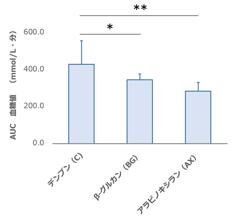 BG及びAX単回投与後のセカンドミール時の30分後の血糖値は、AX 群が C群に比べ有意に低く、BG群も低下する傾向が見られました。AUC(5)はBG群およびAX群共にC群と比較して有意に低下しました。