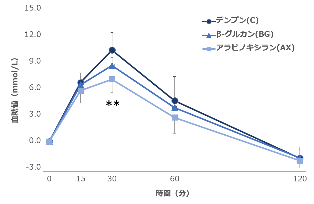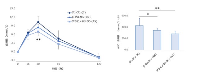 図1.大麦β-グルカンおよびアラビノキシラン抽出物摂取後のセカンドミール時の血糖値変化