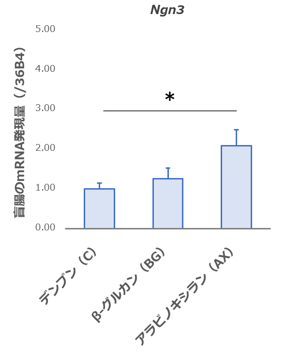 ③GLP-1分泌、機能に関わる遺伝子発現量はBG群とAX群で共に増加する(実験2)。