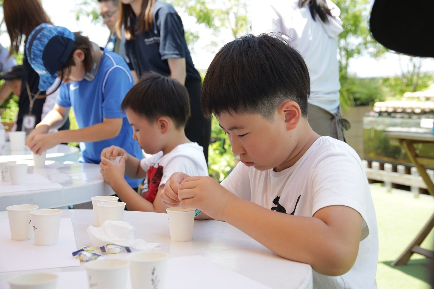 本イベントからの新企画として、水質検査キットを使用し、お水の水質を調べる自由研究企画も実施しました。普段飲んでいるプレミアムウォーターの天然水や、水道水等、身近なお水がきれいなのか汚れているのか、酸性なのかアルカリ性なのか、子供たちは興味津々で調べていました。水質検査をした後は、貴重な資源であるお水を守っていくために、自分たちができる行動は何かについても考えました。