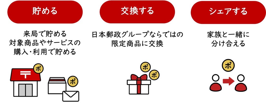 郵便局への来局時にポイントを「貯める」ことができ、貯まったポイントは、郵便局ならではの限定商品などと「交換ができる」ほか、ポイントを家族に「シェアする」ことが可能です。