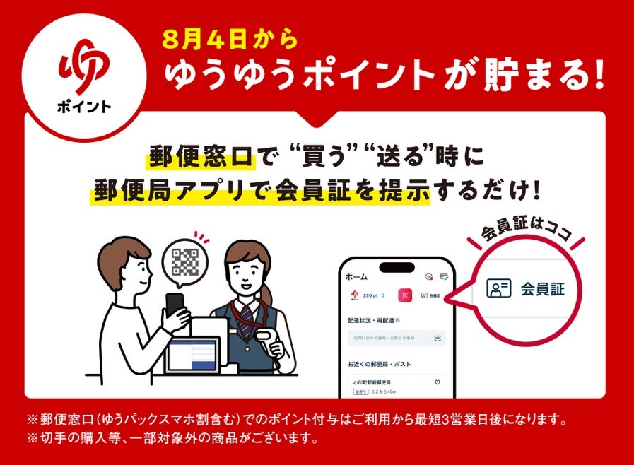 2025年8月4日(月)から、郵便窓口で「郵便局アプリ」の会員証をご提示いただいた上で、対象商品を購入、またはサービスを利用いただくと、購入・利用総額に応じて「ゆうゆうポイント」が貯まるとともに、会員証の提示に対して「ゆうゆうポイント」1ポイントが貯まります。