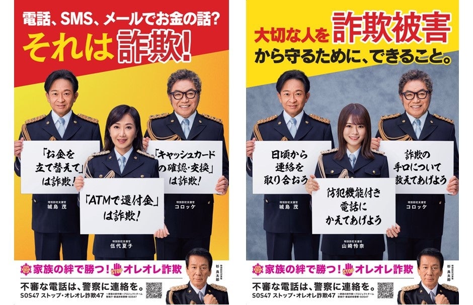 警察庁「ストップ・オレオレ詐欺47〜家族の絆作戦~」プロジェクトチーム(略称:SOS47)は、全国で被害が相次ぐオレオレ詐欺等の特殊詐欺に関する知識や被害防止策を分かりやすく伝え、特殊詐欺被害を防止するため、2018年より、全国47都道府県警察と共に広報啓発活動を行っています。
