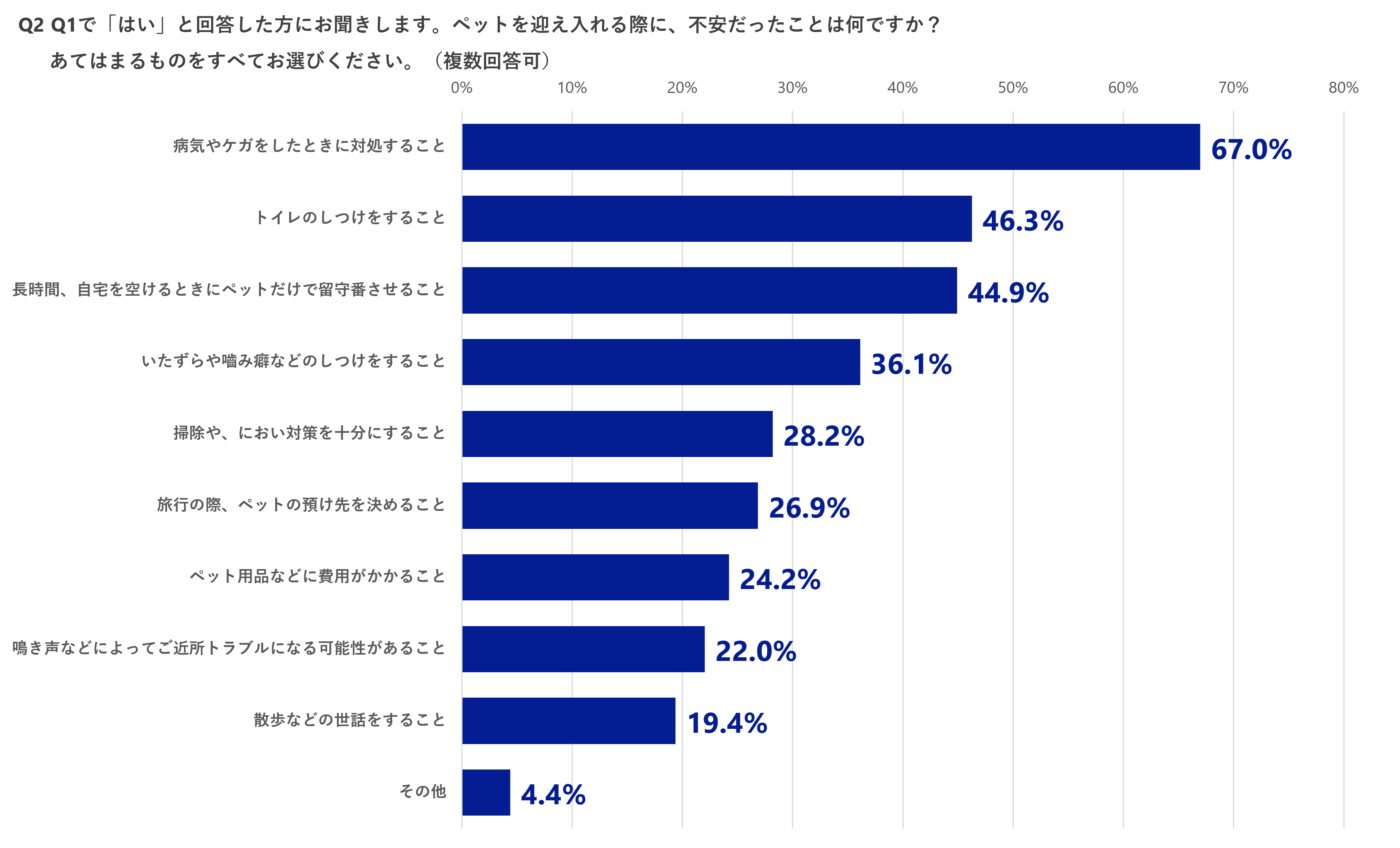2.ペットを迎え入れる際に不安だったことは「病気やケガをしたときに対処すること」が最も多く67.0%。