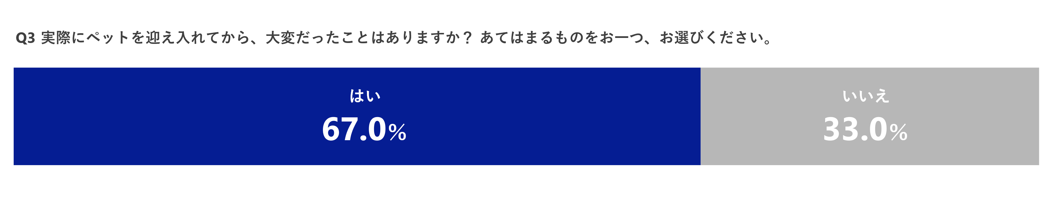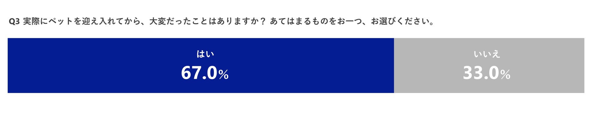 実際にペットを迎え入れてから、大変だったことがあるか伺ったところ「はい」と答えた方は67.0%、「いいえ」と答えた方は33.0%となりました。