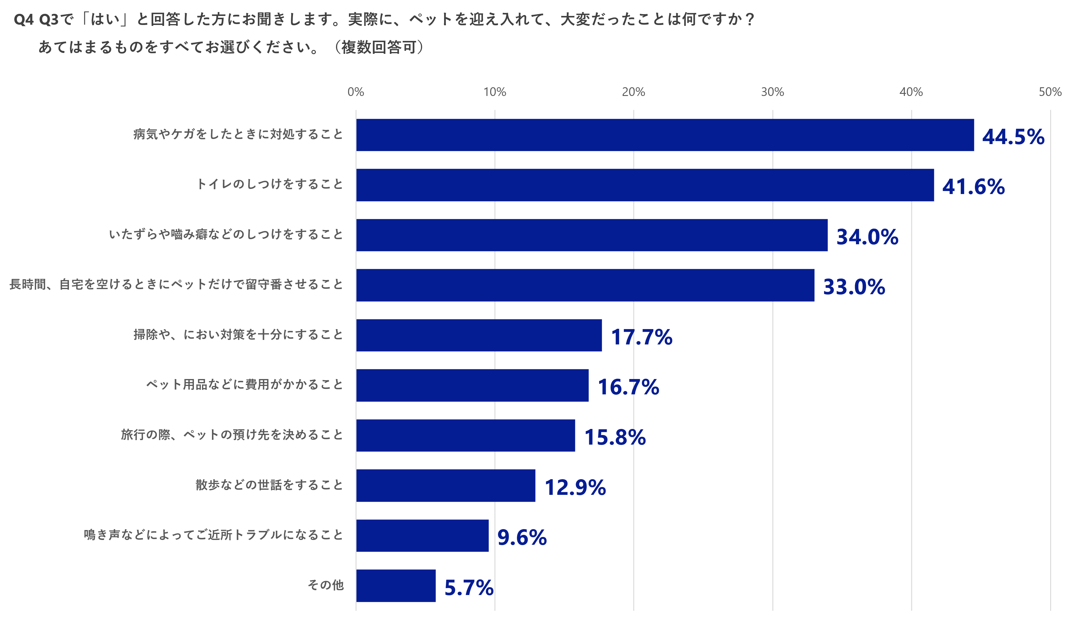 4.実際にペットを迎え入れてから大変だったのは「病気やケガをしたときに対処すること」が最多で44.5%。