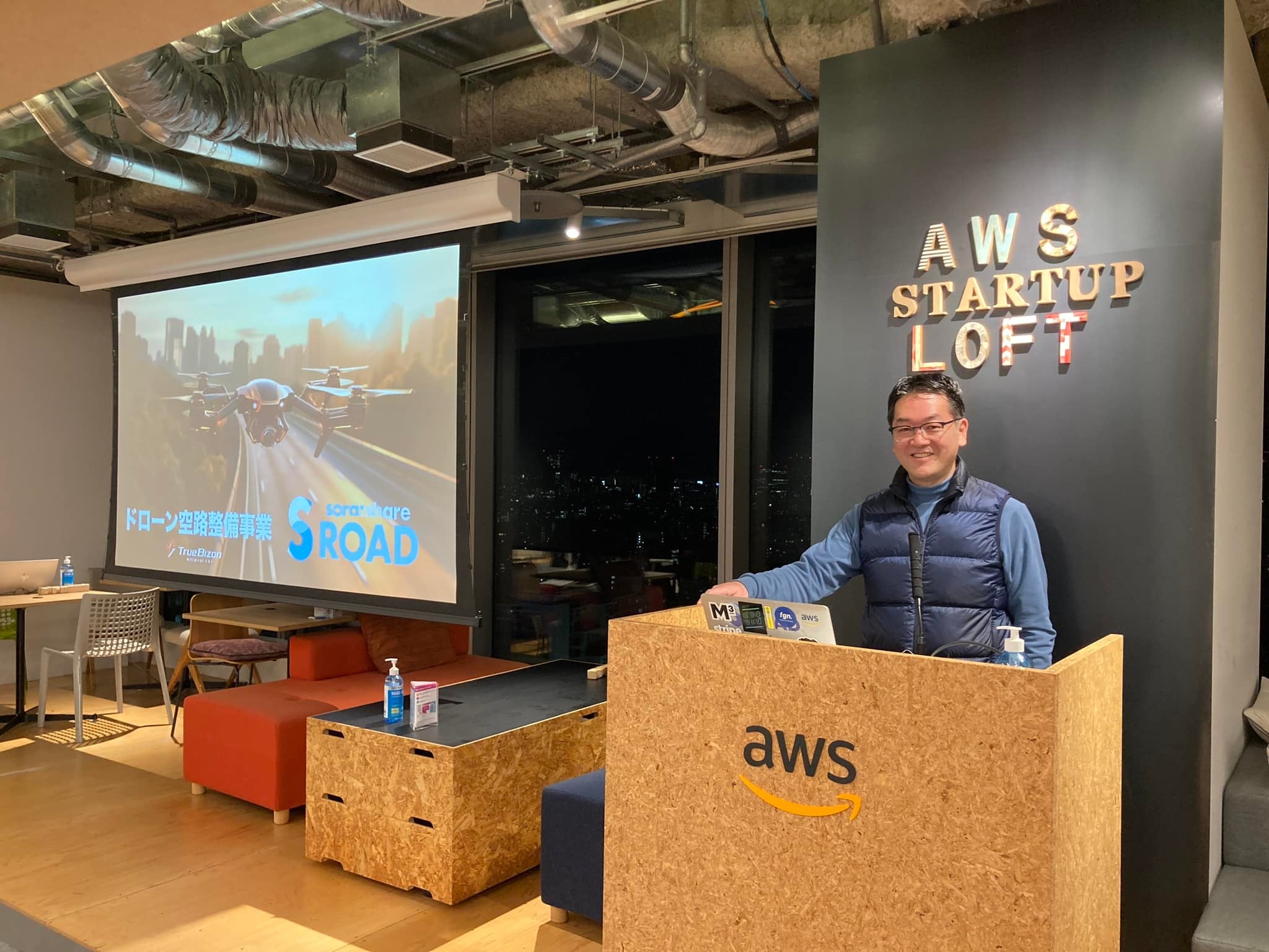 この度はAWSジャパンが展開するスタートアップのためのコワーキングスペースであるAWS Startup Loft Tokyoにて、⾃治体の官⺠連携担当者の皆様へS:ROADをアピールさせていただく機会をいただき、感謝しております。ピッチでは、我々のサービスがいかに自治体や地域社会におけるドローン活用の進展に貢献できるかを発信させていただきました。S:ROADはどこでもドローンを安心して飛行させることができるよう、地域が一体となって空路を建設していくためのプラットホームです。S:ROADがドローンのポテンシャルを最大限に引き出せるよう、今後とも産業に貢献していきたいと考えています。