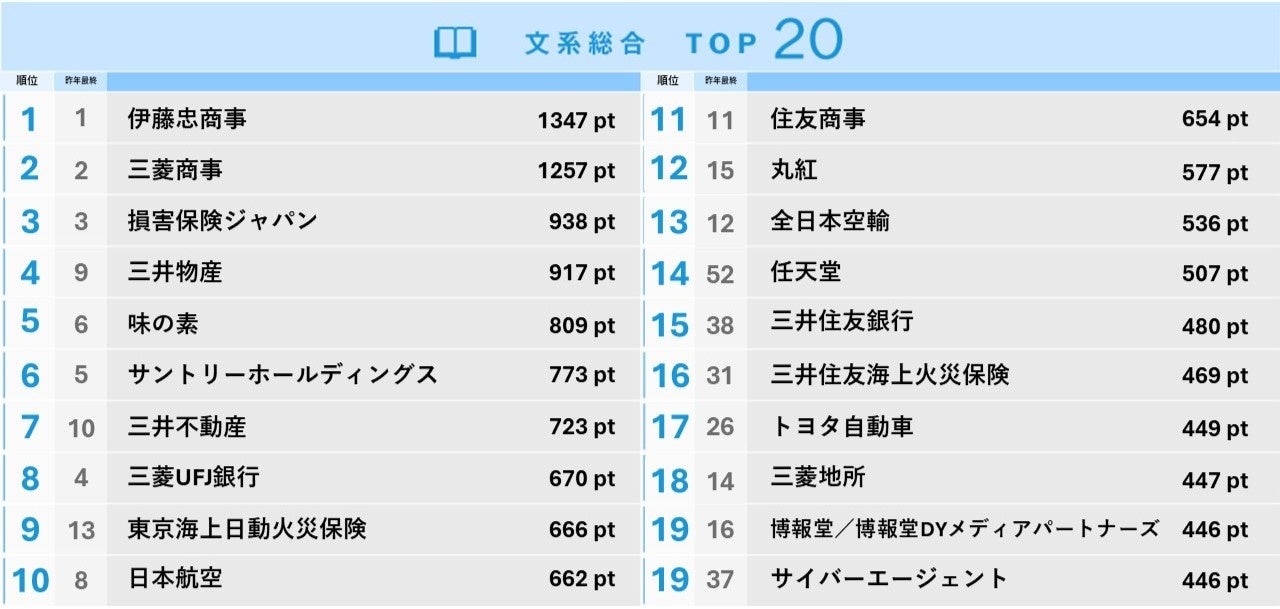 1. 文系総合:伊藤忠商事が5年連続の首位獲得。幅広い業界に支持が分散