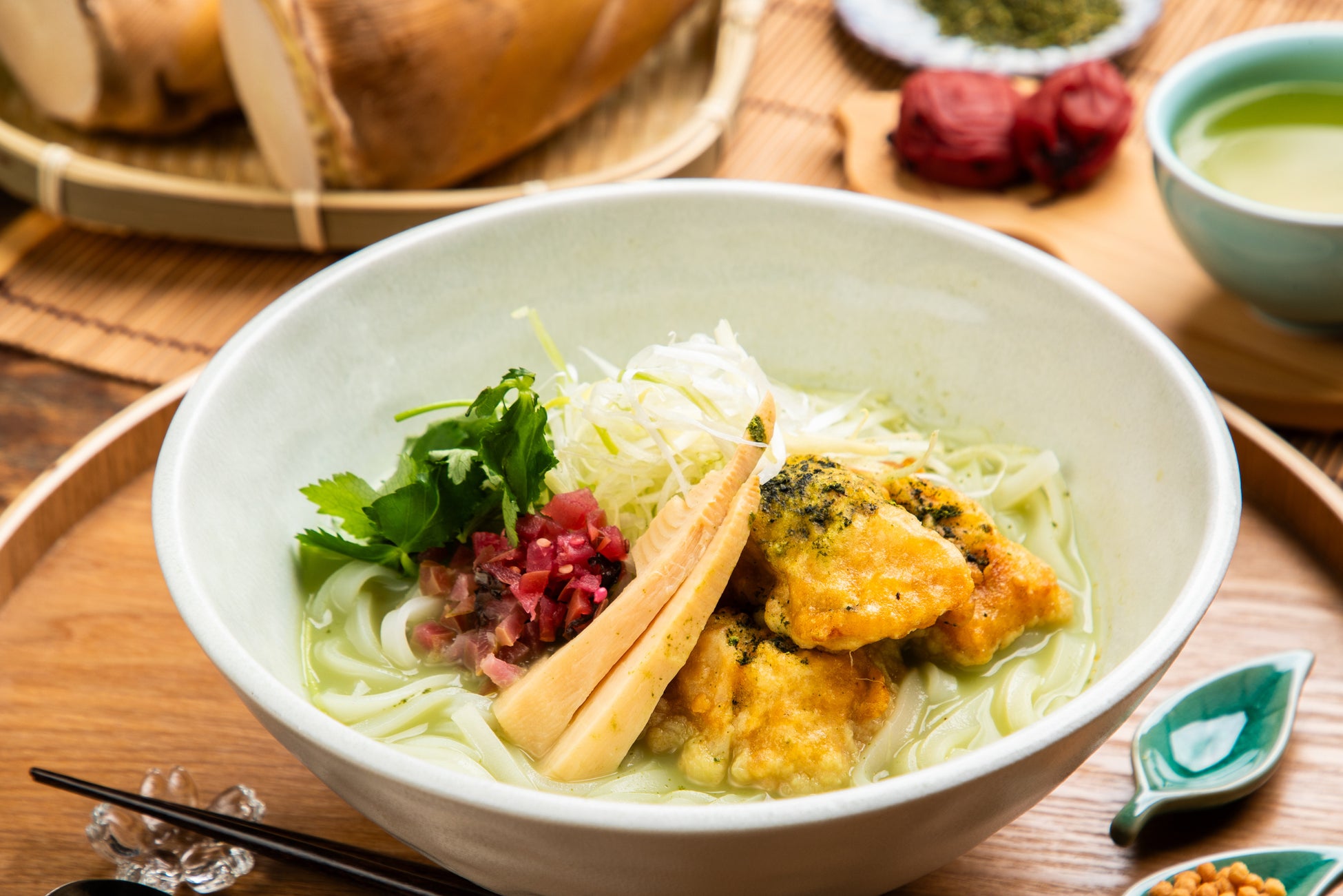 国産米麺×国産緑茶。筍やカリカリ梅で日本らしい春を満喫していただける一杯です。