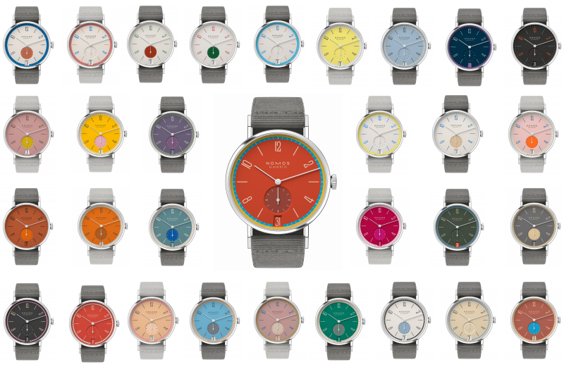 ノモスを象徴する「タンジェント」の日付表示機能を備えた「タンジェント 38 デイト」が、カラフルな31色のカラーバリエーションで登場。