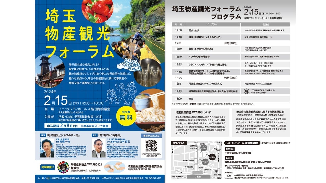 一般社団法人埼玉県物産観光協会(会長:朝霧重治)は、埼玉県全域の経営力向上や稼ぐ観光地域づくりを推進するため、行政、DMO、民間事業者の皆様を対象とした「埼玉物産観光フォーラム」を開催することといたしましたのでお知らせいたします。
