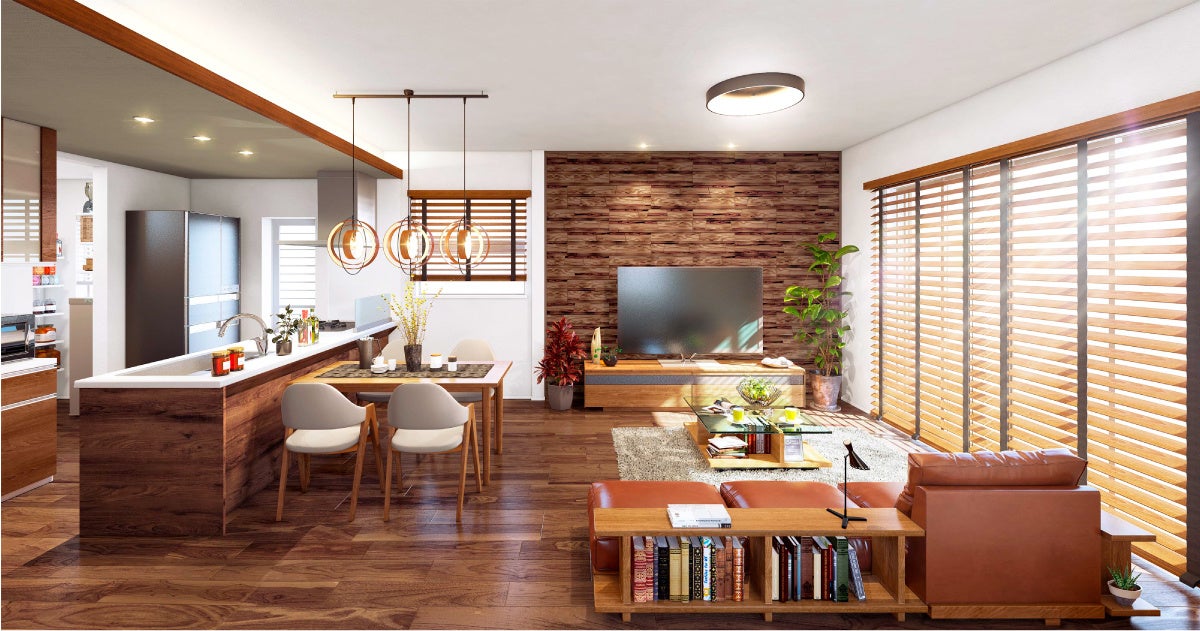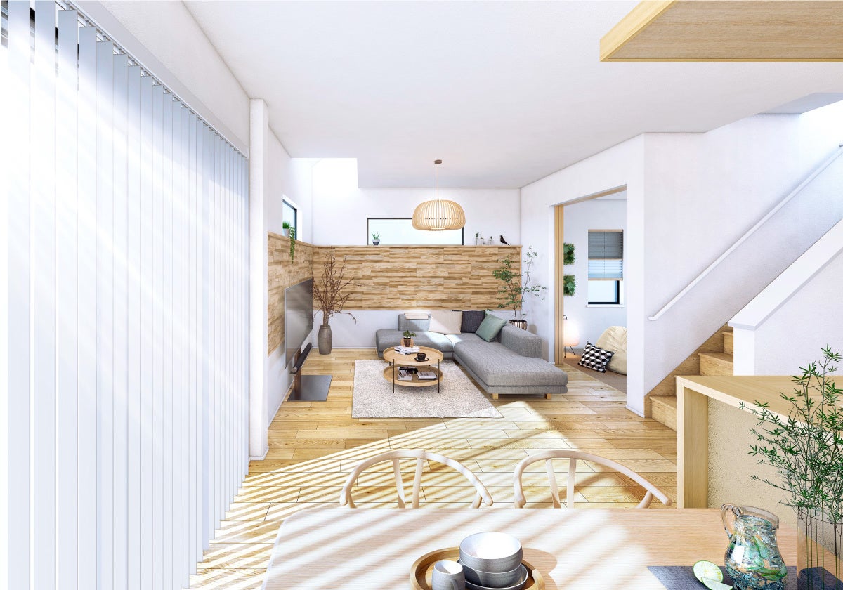 また、リビングの天井高は2.7Mに設定。高さ2.2Mのハイサッシから温かな陽光が室内に注ぎ込みます。開放感のあるリビングでゆとりある暮らしが堪能できます。