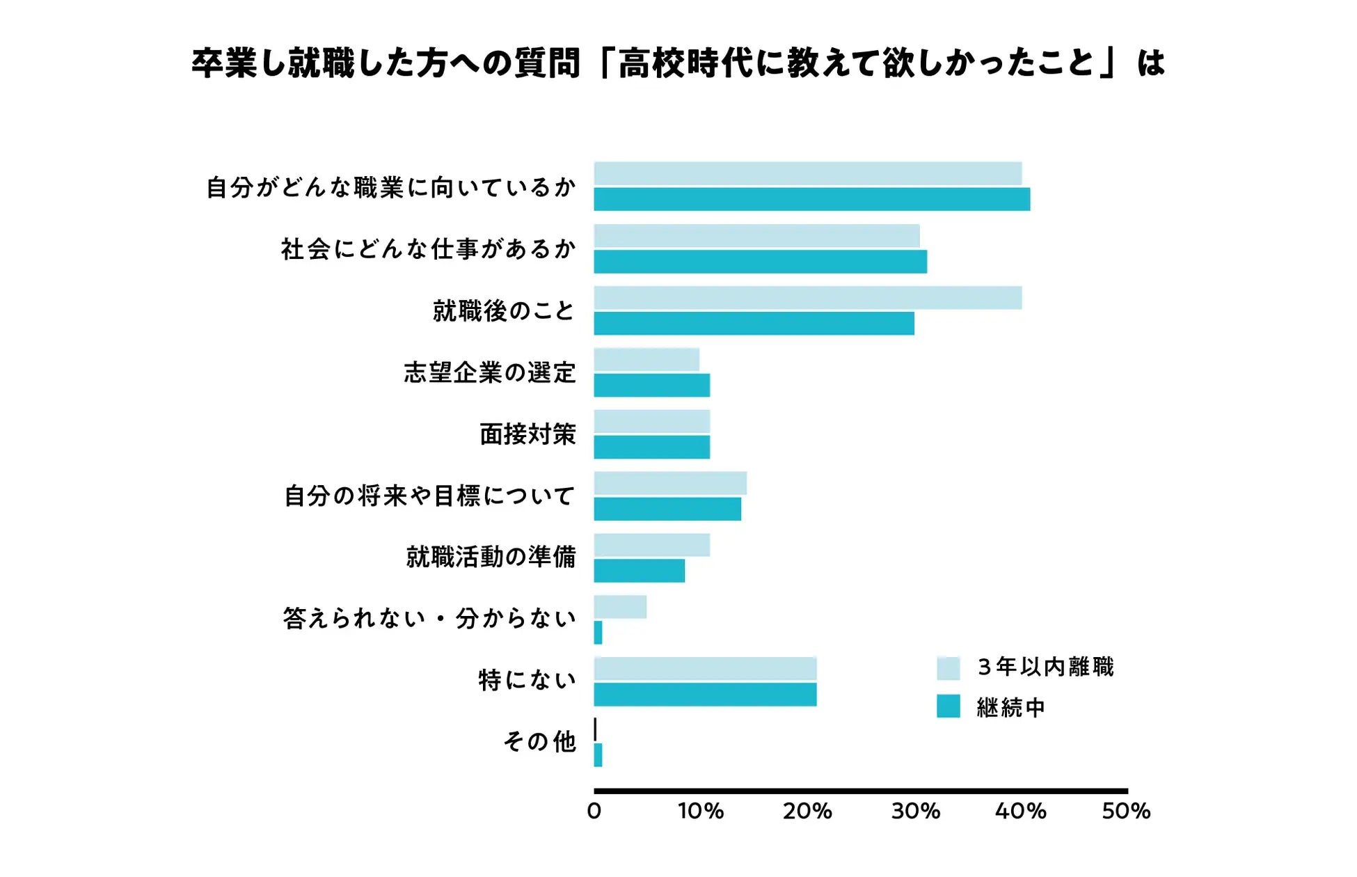 しかし学校現場では、コストや時間や教員の負担の大きさなどの障壁があり、高校だけでのキャリア教育には手法に限りがあるといったお声が多くありました。また高卒で社会人になった方へのアンケート(※1)では「高校の進路指導や就職活動の時に教えて欲しかったこと」に対して、「自分がどんな職業に向いているか」「社会にどんな仕事があるか」「就職後のこと」が上位回答でした。