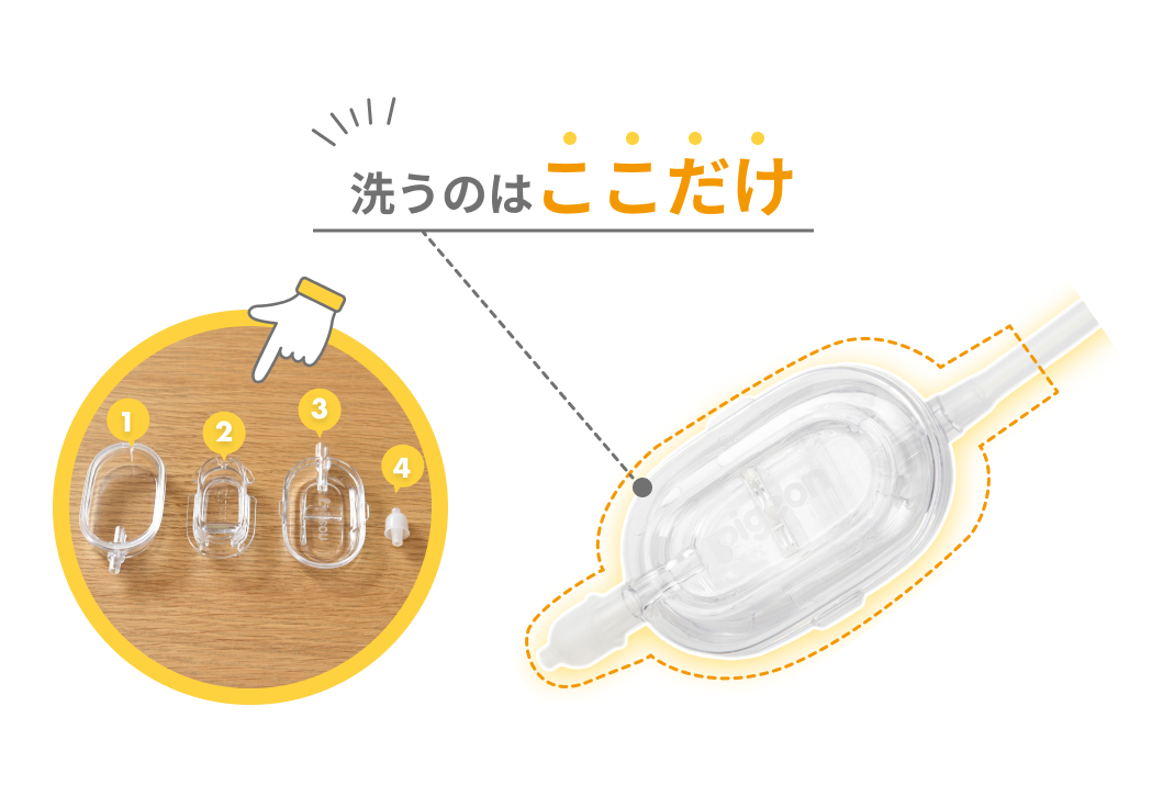 「鼻水キャッチャー」の内部を2層構造にしたことで、チューブへの鼻水の流れ込み防止機能を強化。チューブに鼻水が入らないため、吸引後は「フィット鼻ノズル」と「鼻水キャッチャー」を洗うだけで、簡単にお手入れができます。赤ちゃんのお鼻に入れるものだから簡単に清潔に保ちたい、そんなママ・パパの想いを実現しました。