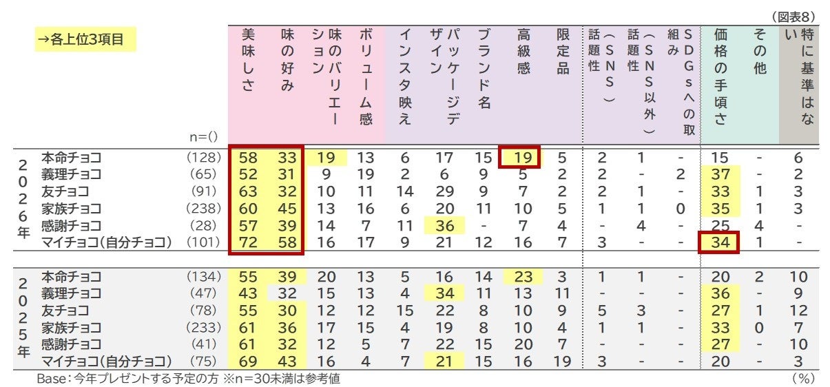 本命チョコでは「高級感」と「味のバリエーション」が続いた一方で、マイチョコ(自分チョコ)では「価格の手ごろさ」が昨年比で増加し上位3項目に入り、仮説として物価高がマイチョコを選ぶ基準に影響している可能性がある。