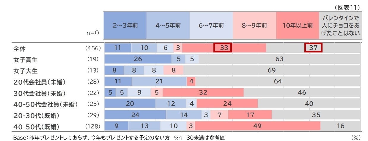 昨年も今年もバレンタインでチョコをプレゼントしていない方に中止時期を聞いたところ、約3割強が「10年以上前」、約4割弱が「バレンタインで人にチョコをあげたことがない」と非実施者の内3割しか直近9年以内にチョコレートをプレゼントしていないという結果になりました。属性別に見ると40-50代(既婚)は約5割が「10年以上前」にバレンタインを中止と回答しました。また、参考値にはなりますが、女子高生、女子大生、20代会社員(未婚)はそれぞれ6割以上が「バレンタインで人にチョコをあげたことはない」と若年層ほど未経験者が多い傾向が見られました。