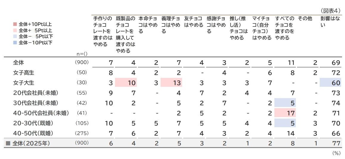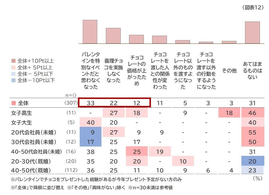 値上げの影響による変化を確認したところ、「すべてのチョコを渡すのをやめる」のは1割強という結果でした。「影響はない」と回答した方は昨年比で-8ptと昨今の値上げはバレンタインに影響を与えている可能性が示唆されます。