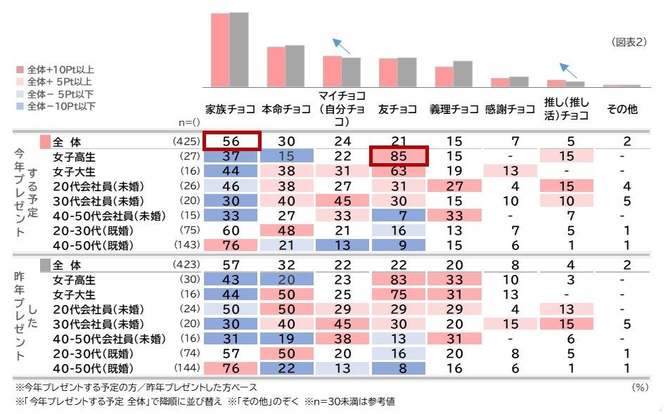 今年プレゼントする予定のチョコの種類を聞くと、全体では「家族チョコ」が56%と高いですが、女子高生は「友チョコ」が最も高い等、属性間で差がみられます。各チョコ、昨年比で減少傾向にある一方で、昨今のバレンタインで話題となっている「マイチョコ(自分チョコ)」・「推しチョコ」はポイントが増加傾向でした。