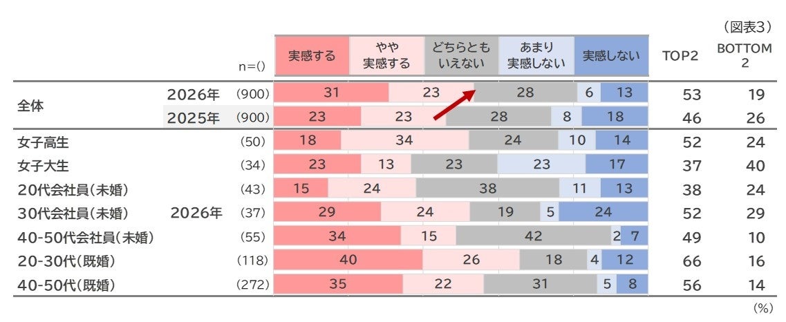 半数以上が値上げを「実感する」「やや実感する」と回答しています。2025年より+7ptと、この一年間で値上げ実感が強くなっています。