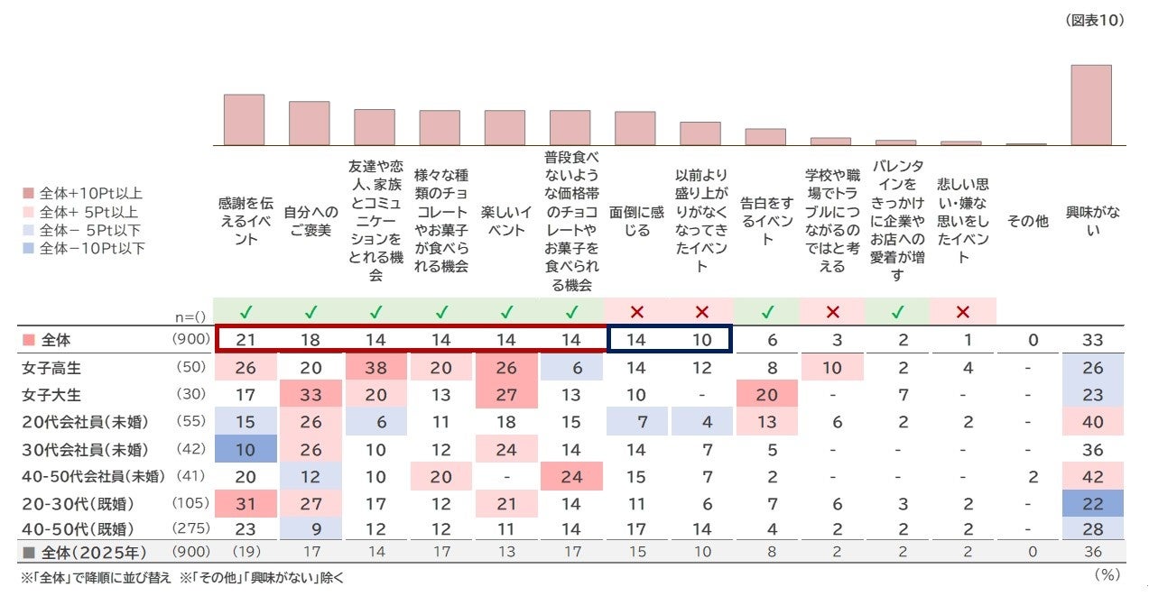 「感謝を伝えるイベント」が21%と最も高く、次いで「自分へのご褒美」が18%、その後もポジティブな評価が14%で続きました。一方で、女性にとってバレンタインが「告白をするイベント」という意識は低く、昨年同様に「面倒に感じる」、「以前より盛り上がらなくなってきたイベント」よりも低い結果となりました。バレンタインは感謝を伝えたり、自分に対してご褒美をあげるイベントとしての認識が広がっている傾向が見られます。