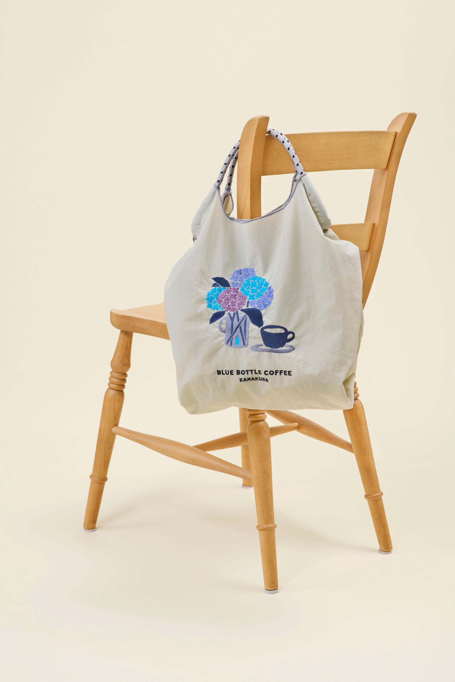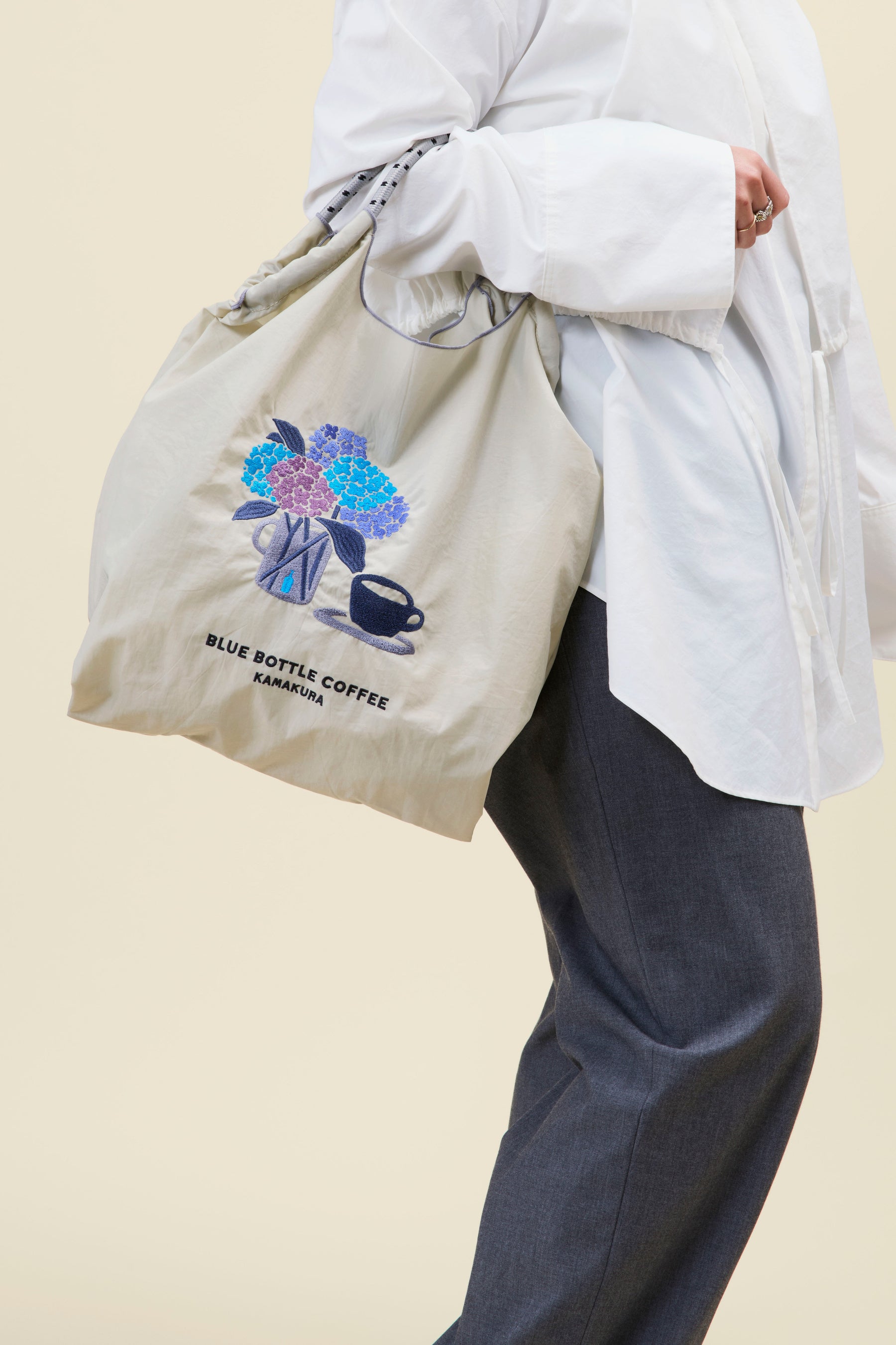 鎌倉の街散策にもぴったりのバッグが、鎌倉カフェと公式オンラインストア限定で登場いたします。デザインやプロダクトの力を通して世の中を元気にする「Ball&Chain(ボールアンドチェーン)」とコラボレートし、製作いたしました。鎌倉カフェオープンをセレブレートし、鎌倉を象徴する紫陽花を刺繍で施しました。現在販売中でご好評いただいている「コーヒーリーブス」や「ブルーボトル(ホワイト)」のサイズよりもひと回り小さいMサイズでご用意しており、よりコンパクトで持ちやすいサイズ感に。この季節のお出かけに心が弾むような限定バッグを、ぜひ日常に取り入れてみてはいかがでしょうか。