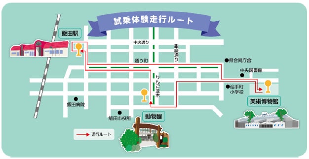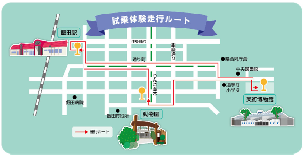 実験 内容 | 中心市街地における3つの停留所(飯田市美術博物館、飯田市立動物園、JR飯田駅) を周回するルートを、自動運転EVバスが自動運転レベル2で走行 |