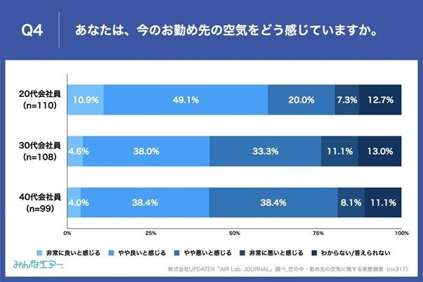 〜今の勤め先の空気、20代の半数以上が「良い」と感じているのに対し、30代、40代は約半数が「悪い」と感じているという結果に~
