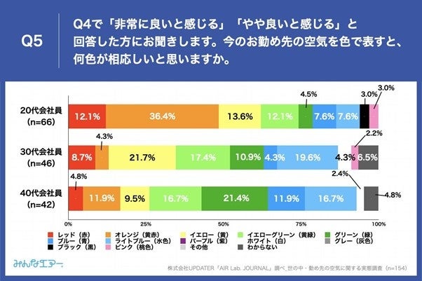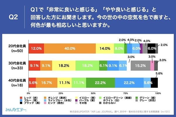 - 今の世の中全体の空気を良いと感じている人が選んだ空気の色、20代会社員が「オレンジ」(40.0%)、30代会社員が「イエロー」や「イエローグリーン」(18.2%)、40代会社員が「グリーン」や「ブルー」(22.2%)