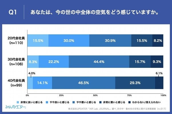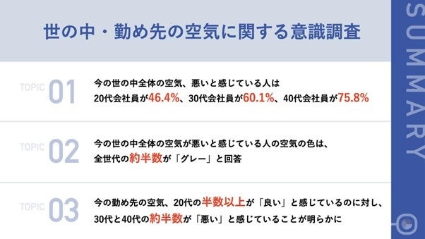 - 今の世の中全体の空気、悪いと感じている人は20代会社員が46.4%、30代会社員が60.1%、40代会社員が75.8%