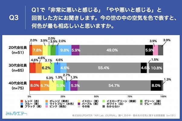 社会・会社の空気を“色”で例えると⁉ 20~40代会社員の4割以上が「世の中全体の空気が悪い」と回答 カラーで表すと、「グレー」が半数近くに