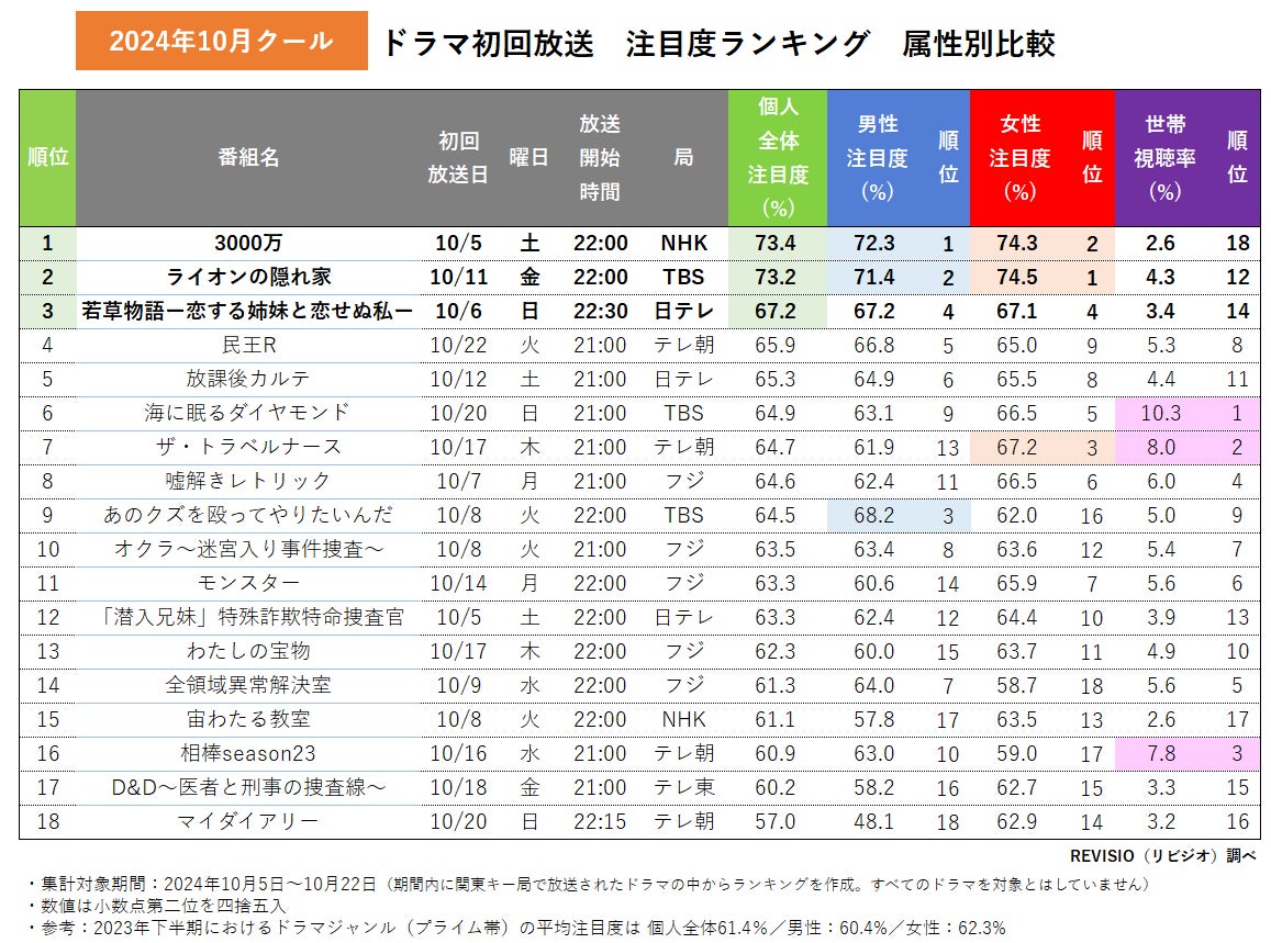 ご家庭に人体認識技術を搭載した機器を設置し、テレビスクリーンへの「アテンション(注視)」を測るREVISIO株式会社(本社:東京都千代田区、代表取締役社長 郡谷康士、以下REVISIO)は、2024年10月にスタートした秋ドラマについて、初回放送の注目度ランキングを作成し、人気の傾向を分析致しました。注目度が高いとは、テレビの前の視聴者がくぎづけになっていたことを表します。