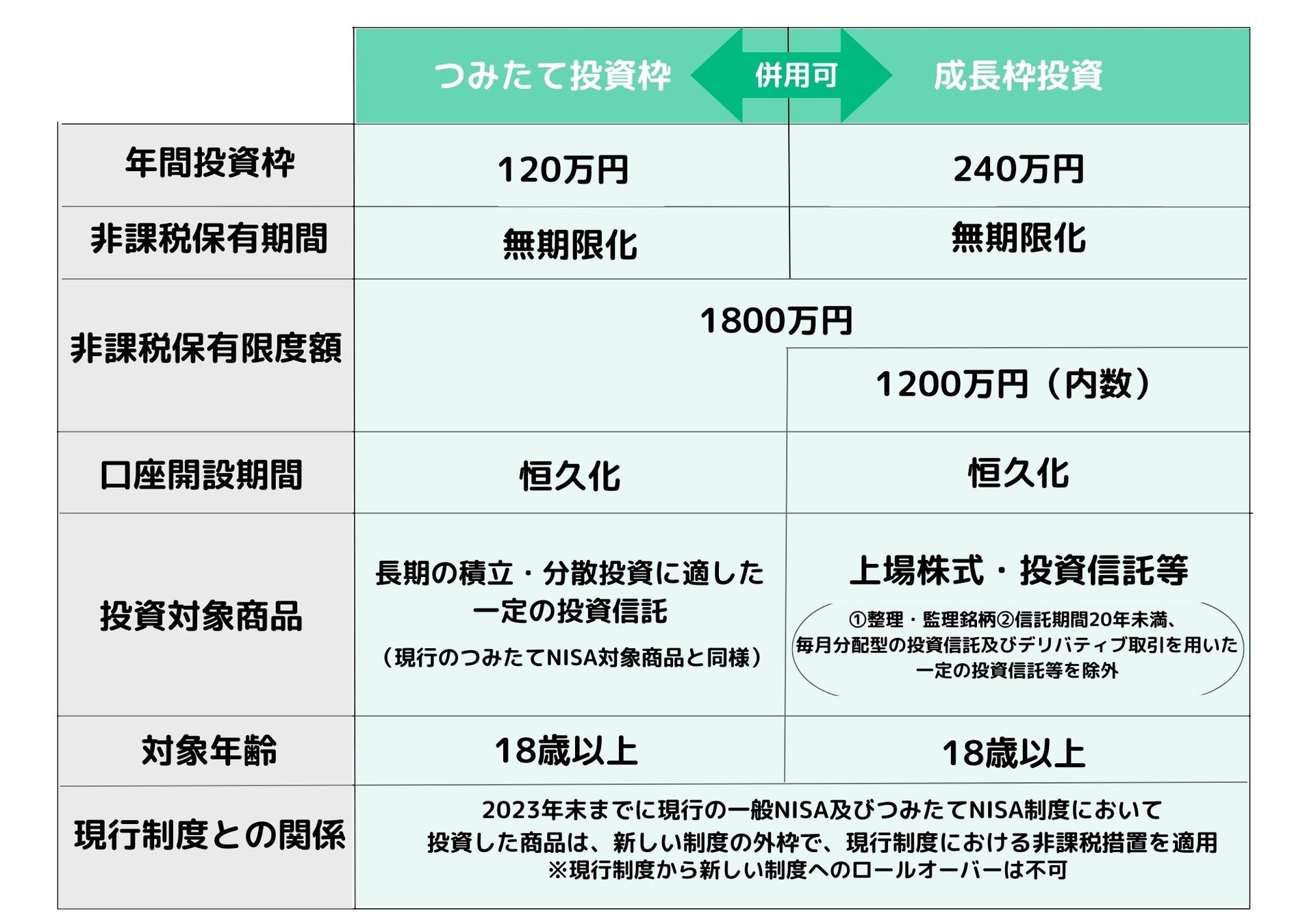 ・年間投資枠の拡大(つみたて投資枠:年間120万円、成長投資枠:年間240万円、合計最大年間360万円まで投資が可能。)