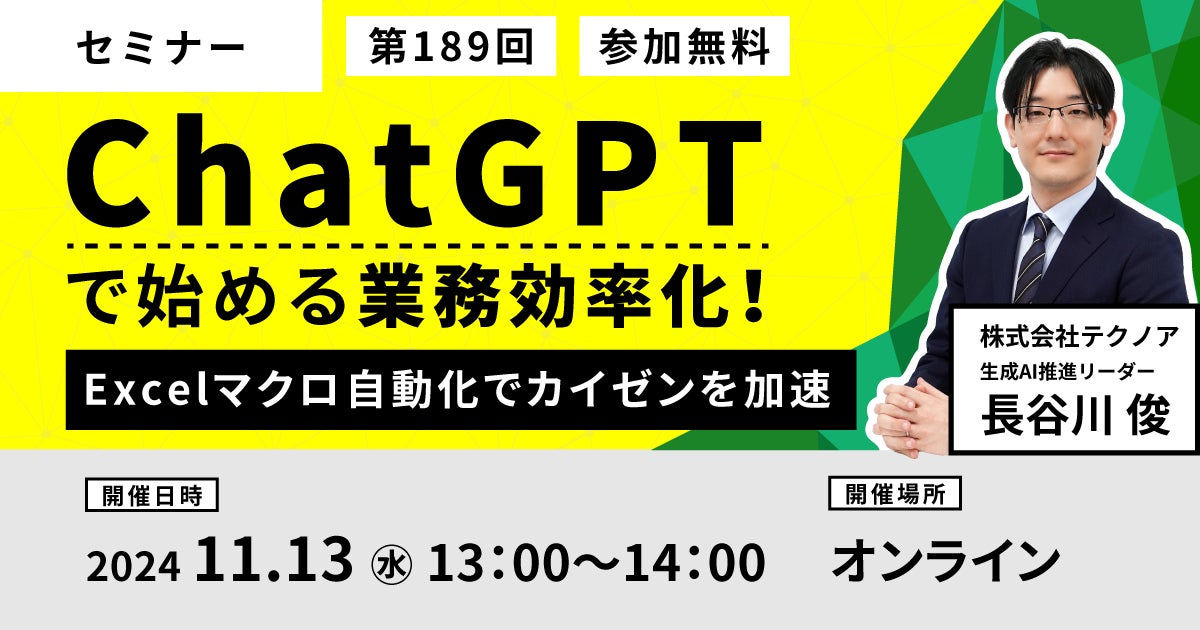 株式会社テクノア(本社:岐阜県岐阜市、代表取締役:山﨑 耕治)は、2024年11月13日(水)13時より、ChatGPT活用術をテーマにした「ChatGPTで始める業務効率化!Excelマクロ自動化でカイゼンを加速」セミナーをオンラインで開催いたします。