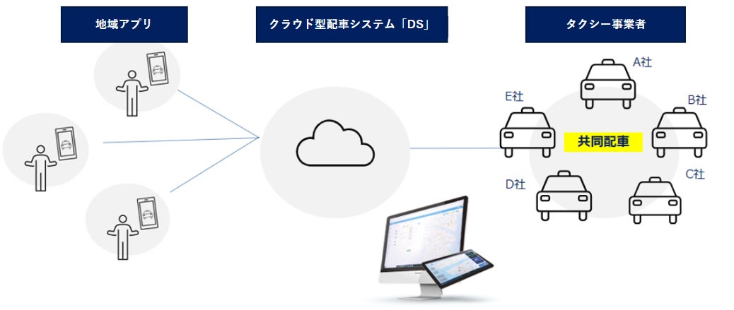 複数のタクシー会社が協力して、地域全体で効率よくタクシーを手配できる「共同配車」の仕組みです。 この「共同配車」は、電脳交通のクラウド配車システム「DS」を使って実現しています。