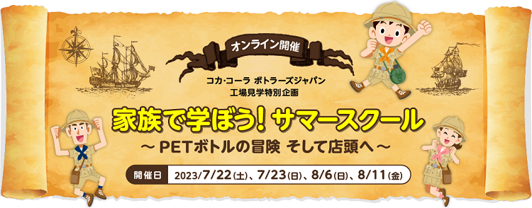 「家族で学ぼう!サマースクール」は、ご家族で楽しみながら学んでいただくことを目的に、夏休み期間中に開催し、通常の工場見学プログラムにはないコンテンツを提供します。本年のサマースクールのテーマは、「PETボトルの冒険 ~そして店頭へ~」。参加者のみなさまに、プリフォーム(PETボトルの原型)が、PETボトルへの成形を経て、お客さまのもとに届くまでの流れを約60分の冒険風のストーリーでご紹介します。製品の原材料である「水」を育む森を守る活動や、製造、物流、営業活動の様子などもご紹介します。また、正しい水分補給の方法など生活に役立つ情報なども、クイズ形式で楽しく学ぶことができます。さらに、クイズの正解者の中から抽選で20名様にコカ・コーラ社製品1ケース、100名様にオリジナルグッズのプレゼントも実施します。