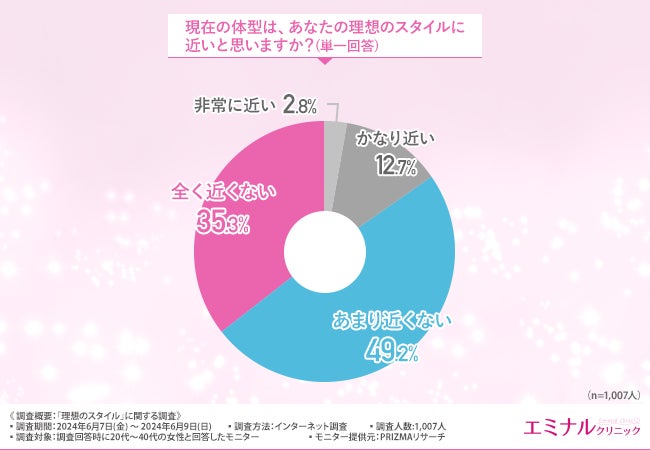 「現在の体型は、あなたの理想のスタイルに近いと思いますか?(単一回答)」と質問したところ、『非常に近い(2.8%)』『かなり近い(12.7%)』『あまり近くない(49.2%)』『全く近くない(35.3%)』と続きました。
