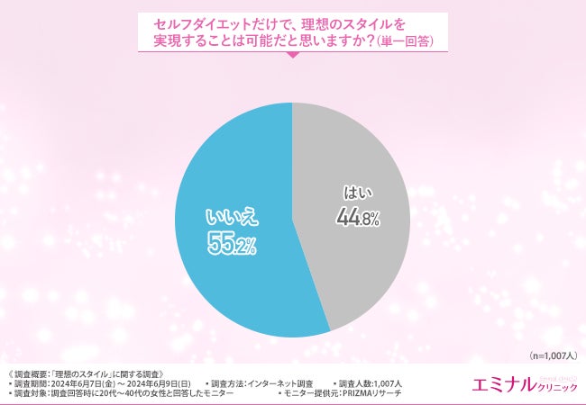 「セルフダイエットだけで、理想のスタイルを実現することは可能だと思いますか?(単一回答)」と質問したところ、約6割の方が『いいえ(55.2%)』と回答しました。