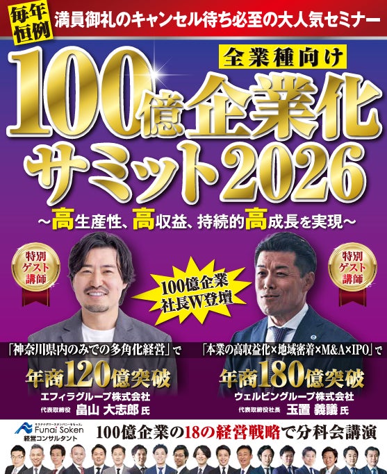 中堅・中小企業を対象に専門コンサルタントを擁する経営コンサルティング会社の株式会社船井総合研究所(本社:東京都中央区、代表取締役社長:真貝 大介、以下、船井総合研究所)は、船井総研グループ東京本社サステナグローススクエア TOKYO(東京ミッドタウン八重洲)にて、「年商100億を最速で実現するための経営戦略サミット2026」を3月3日に開催いたしました。