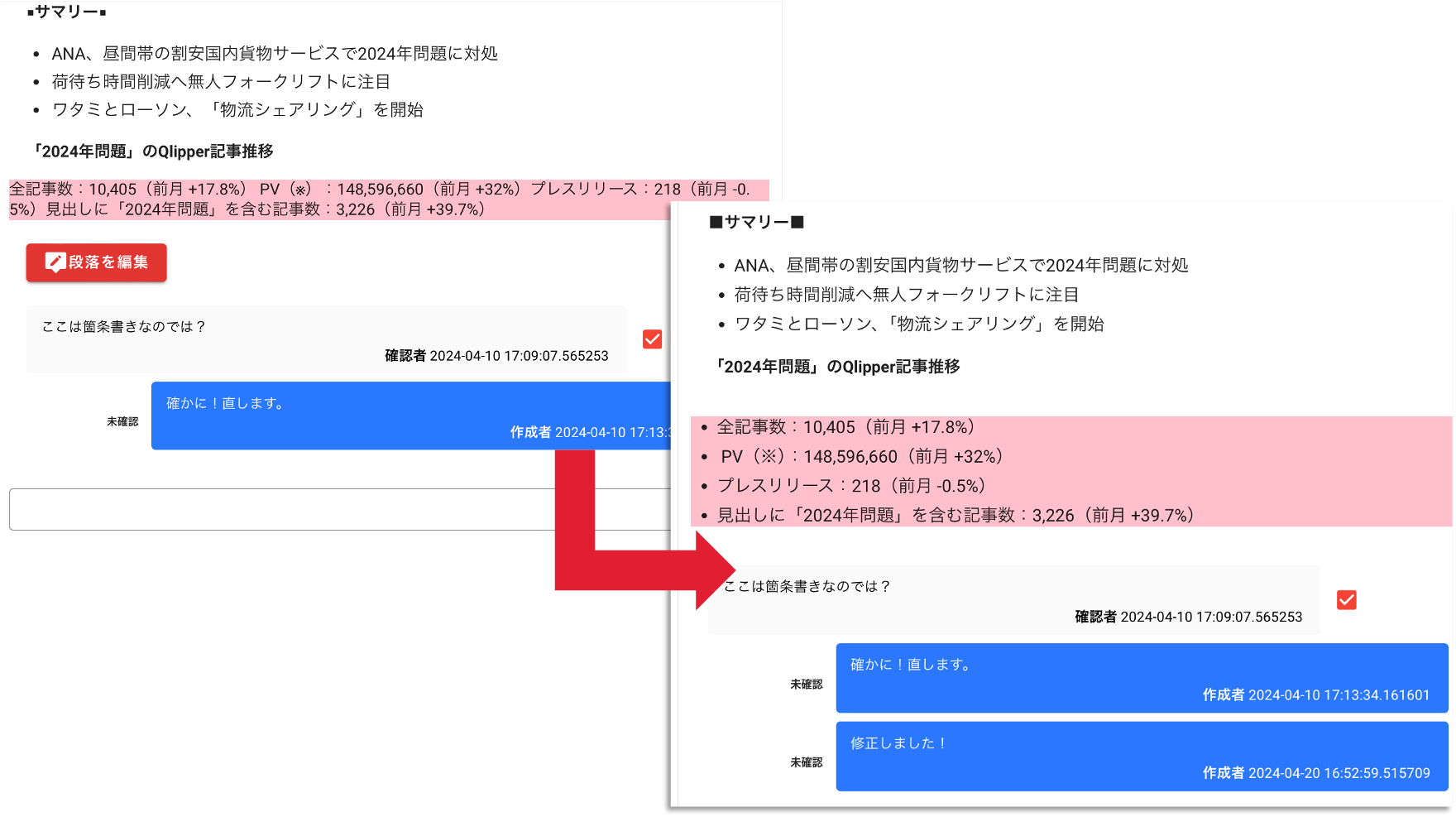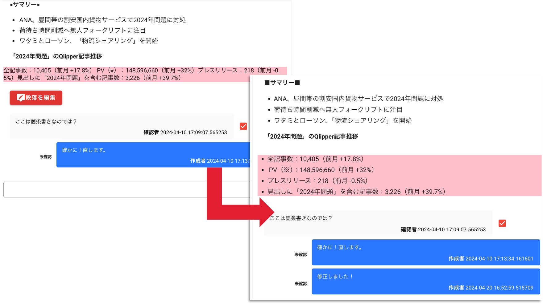 赤入れはコメントを段落ごとに残せるので、複数人でやりとりを重ねながらリアルタイムかつピンポイントに原稿の修正を進められます。