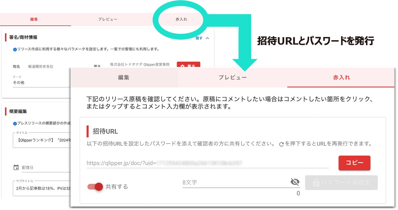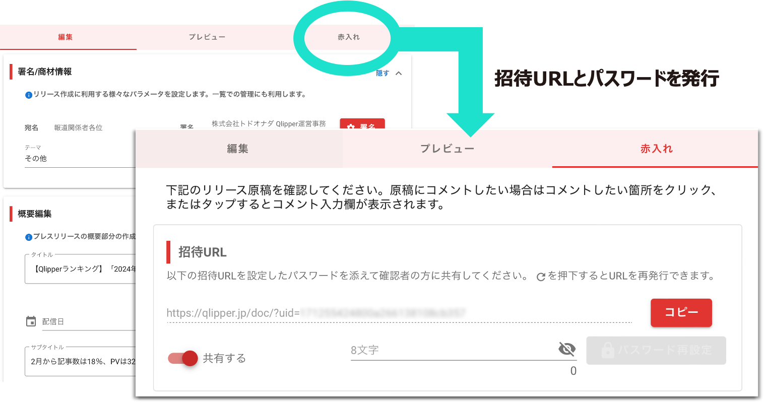 URLとパスワードを発行して、原稿の共有とコメントができます。