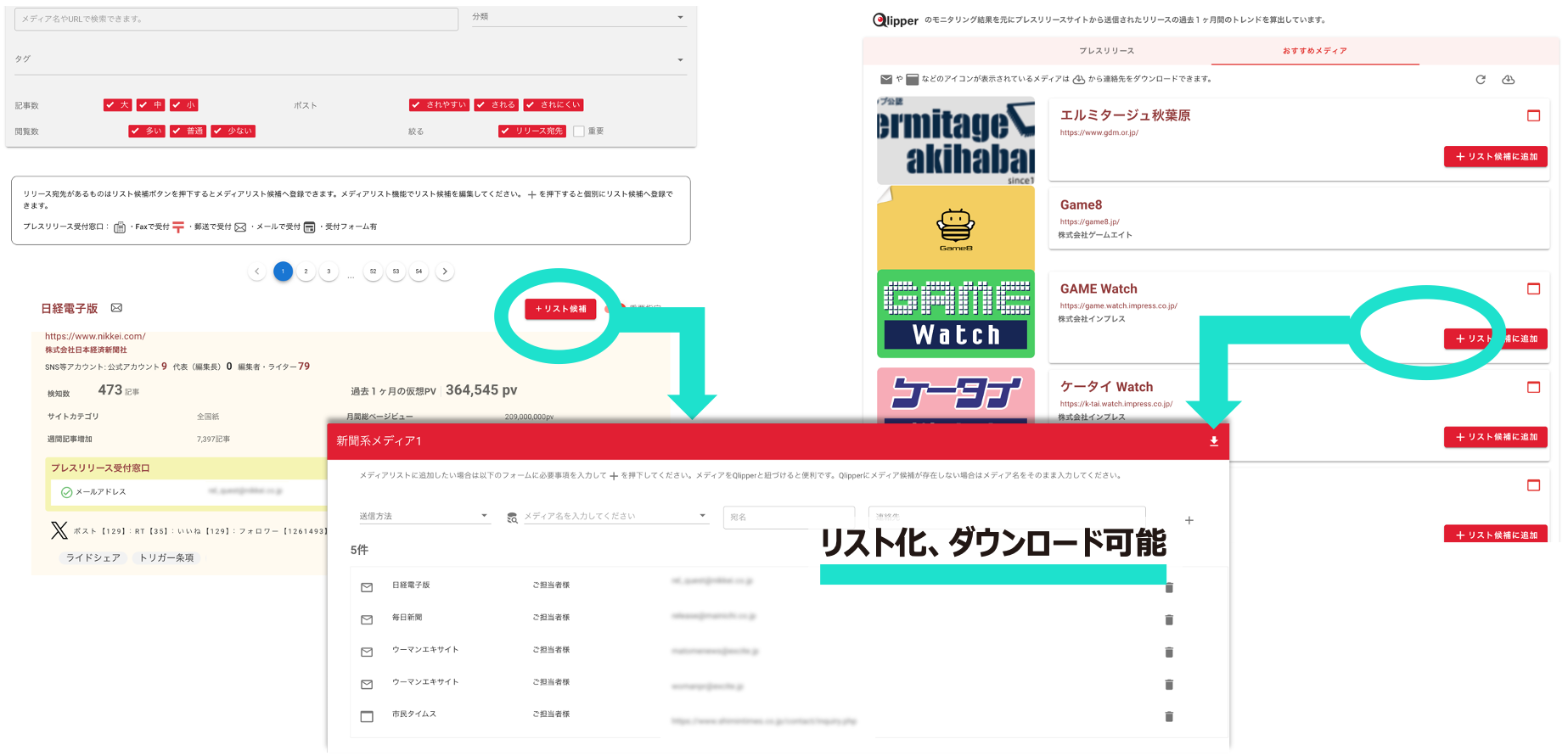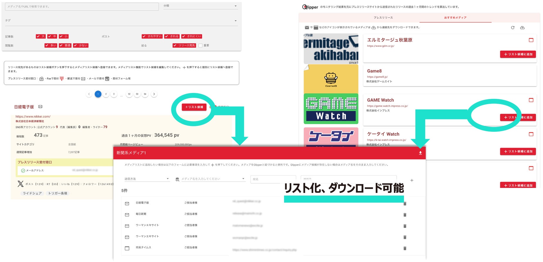 さらにQlipperの有料機能と連携すると、Qlipperが蓄積している4,000メディアのプレスリリース受付窓口やライターの連絡先などのメディア情報を自由に調べて利用できます。