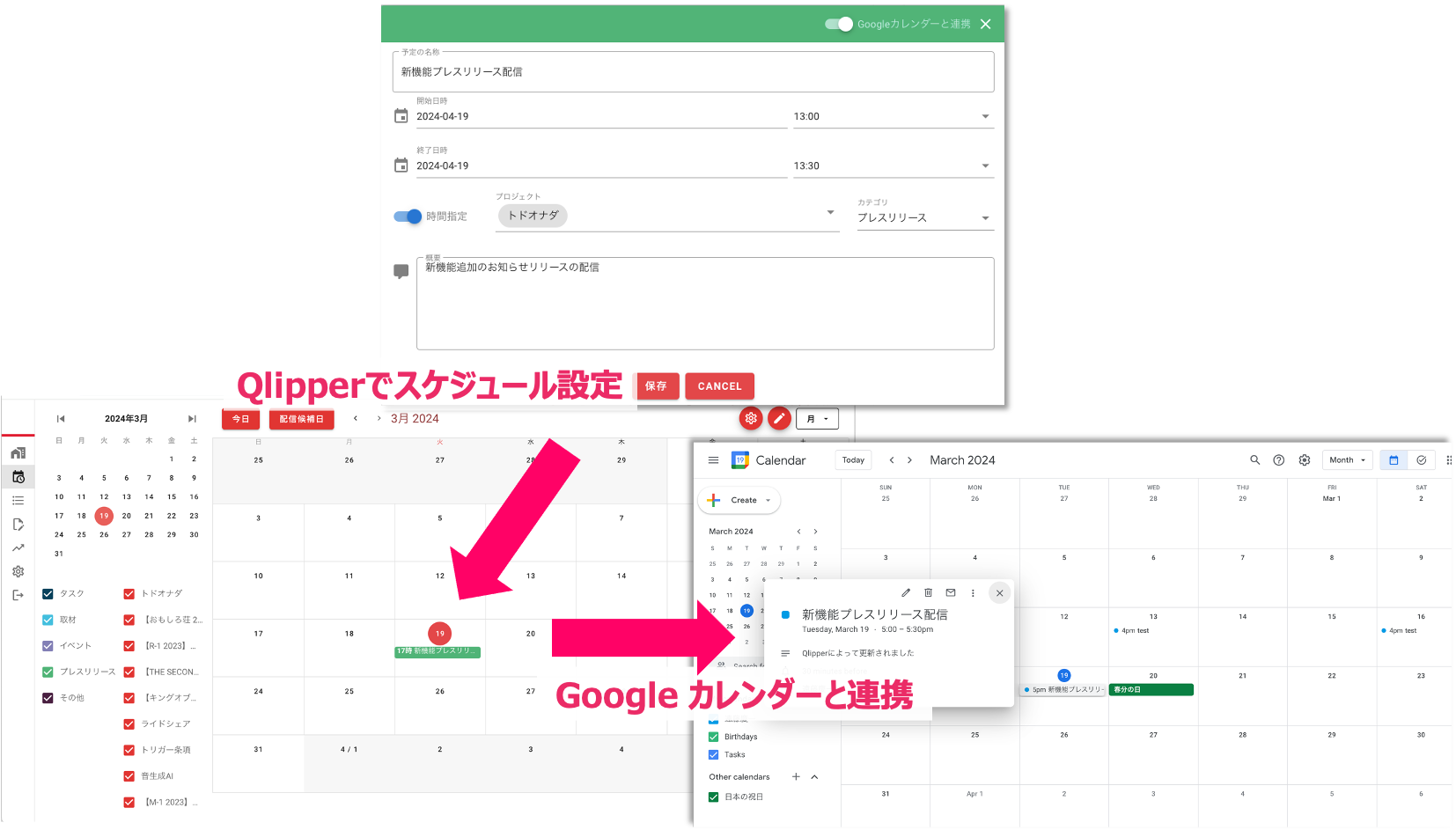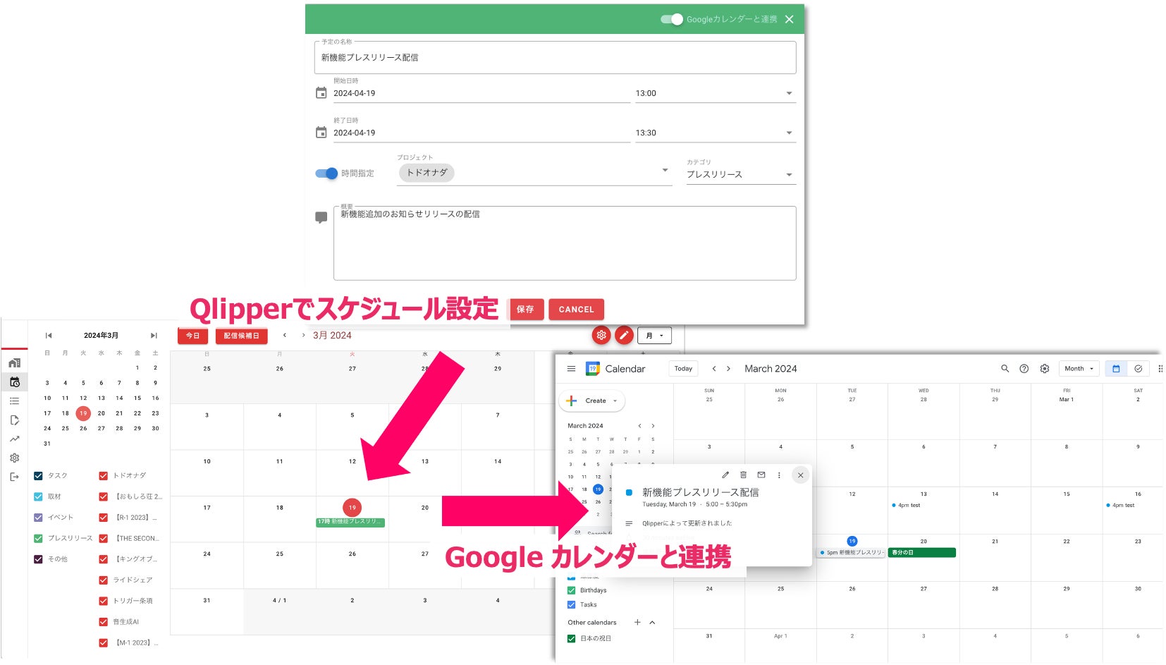 プレスリリースをはじめとしたPR業務をQlipper上で管理し、Google カレンダーと連携できます。