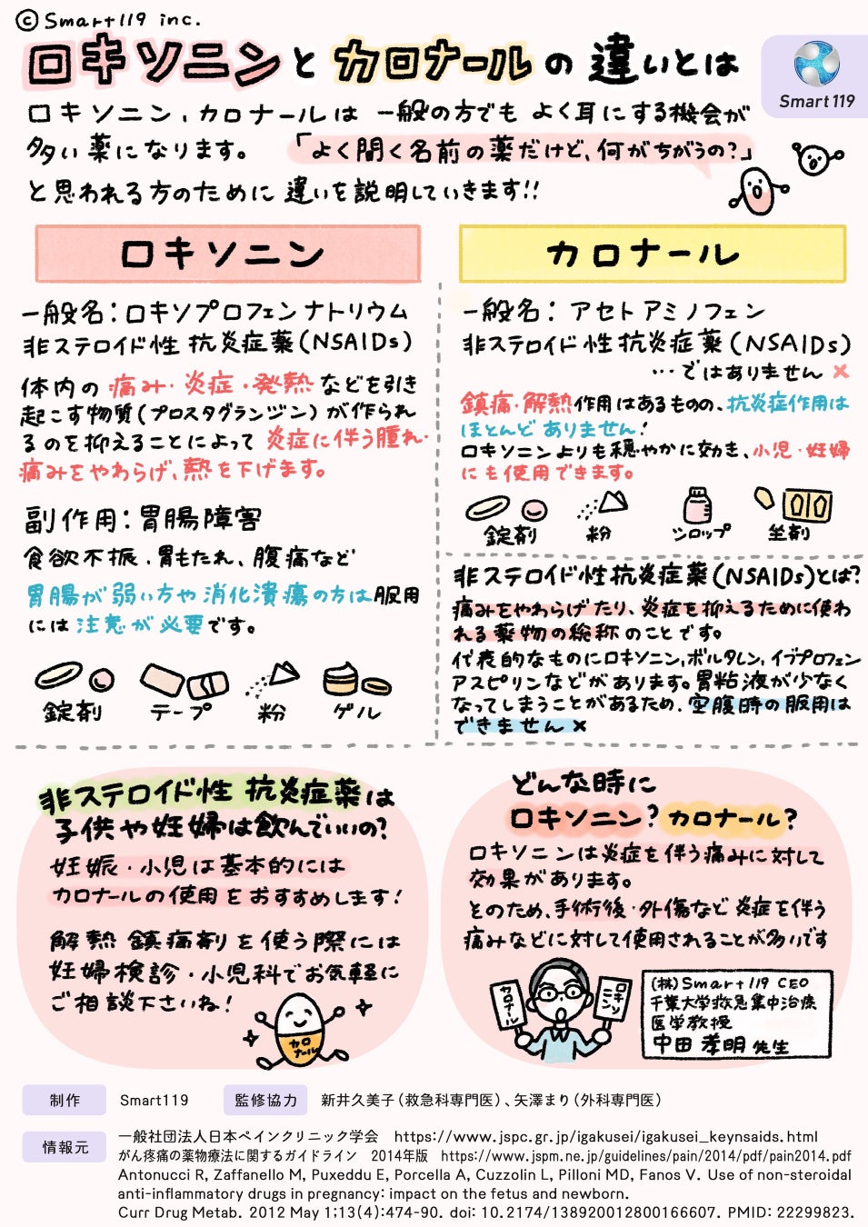 このように「ロキソニン」と「カロナール」には、大きな違いがあります。特に15歳未満の子ども、妊婦、また胃腸の状態には注意が必要です。非ステロイド性抗炎症薬(NSAIDs)には、「ボルタレン」「イブプロフェン」「アスピリン」などの解熱鎮痛剤がありますから、服用の際には、医師や薬剤師へ相談をしましょう。