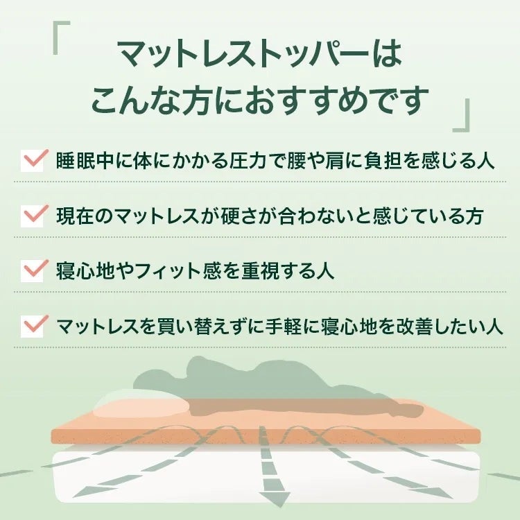 マットレストッパーがおすすめのユーザー例:既存の寝具を活かしながら、手軽に「腰・肩への負担軽減」や「理想の寝心地」を叶えたい方に最適です。