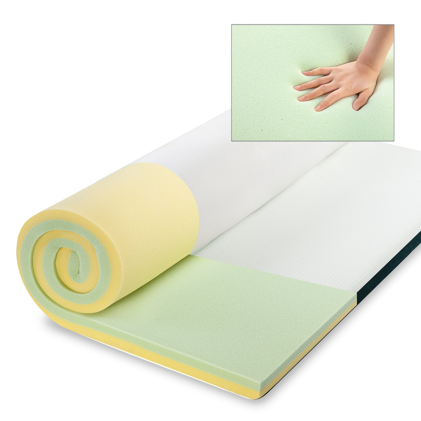 ジヌスの低反発 GreenTea マットレストッパーは、2層の低反発フォームが身体を適切に支えながら圧力を分散するバランス設計を採用しています。