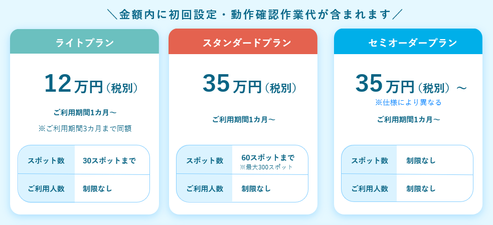 小規模での実施に適した「ライトプラン」、中規模以上で豊富な機能が利用可能な「スタンダードプラン」をご用意しております。また、もっと自由に企画したいという方に向けてカスタマイズが可能な「セミオーダープラン」も提供しております。