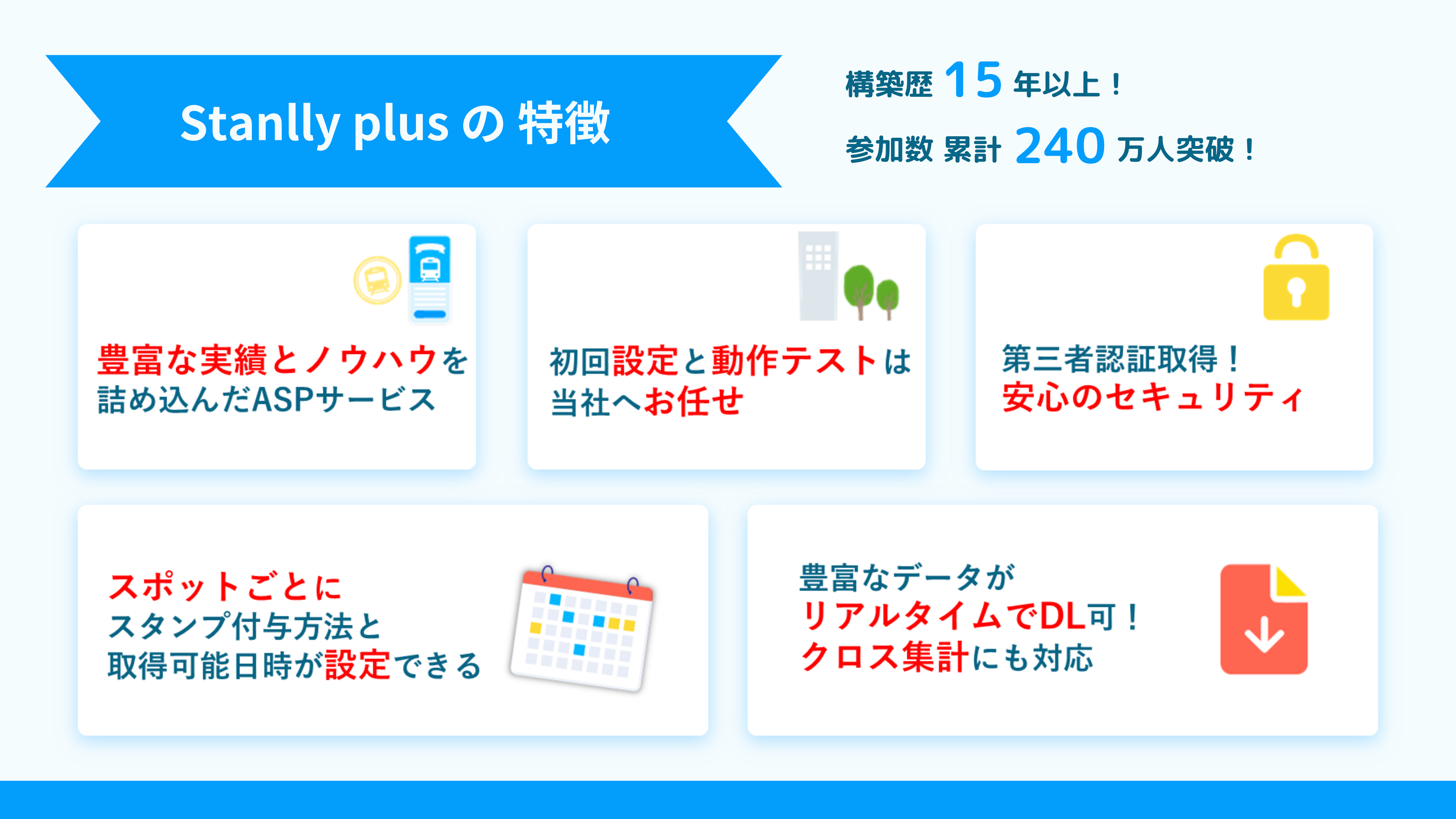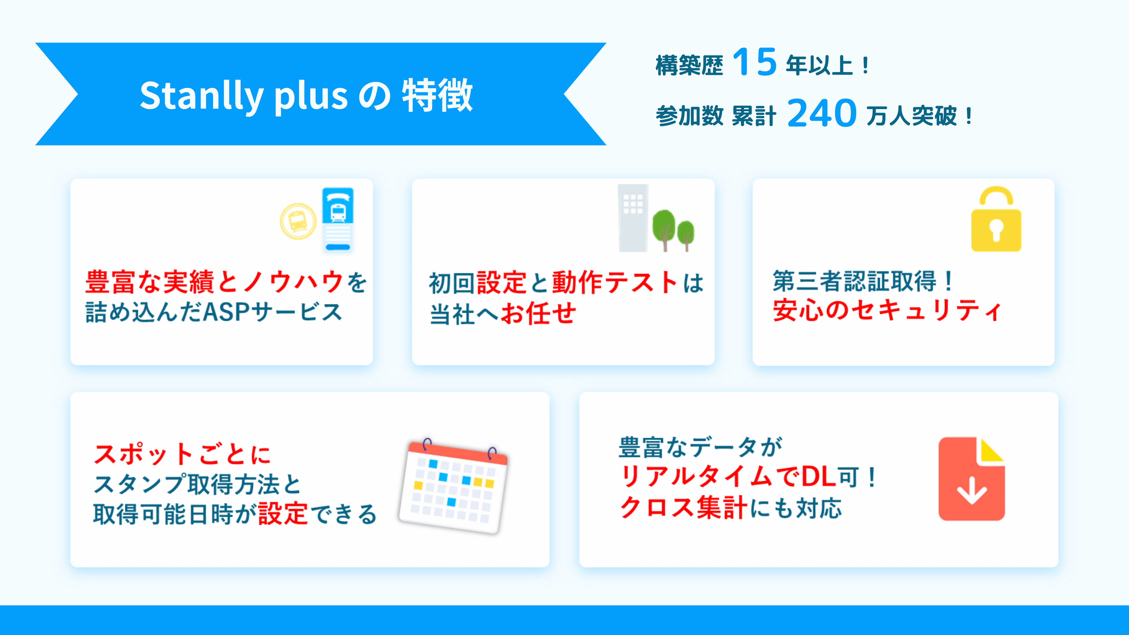デジタルスタンプラリー構築歴15年以上の実績と10,000件を超える経験・ノウハウで、様々な企画や利用シーンに対応できる機能をASPサービスに詰め込みました。