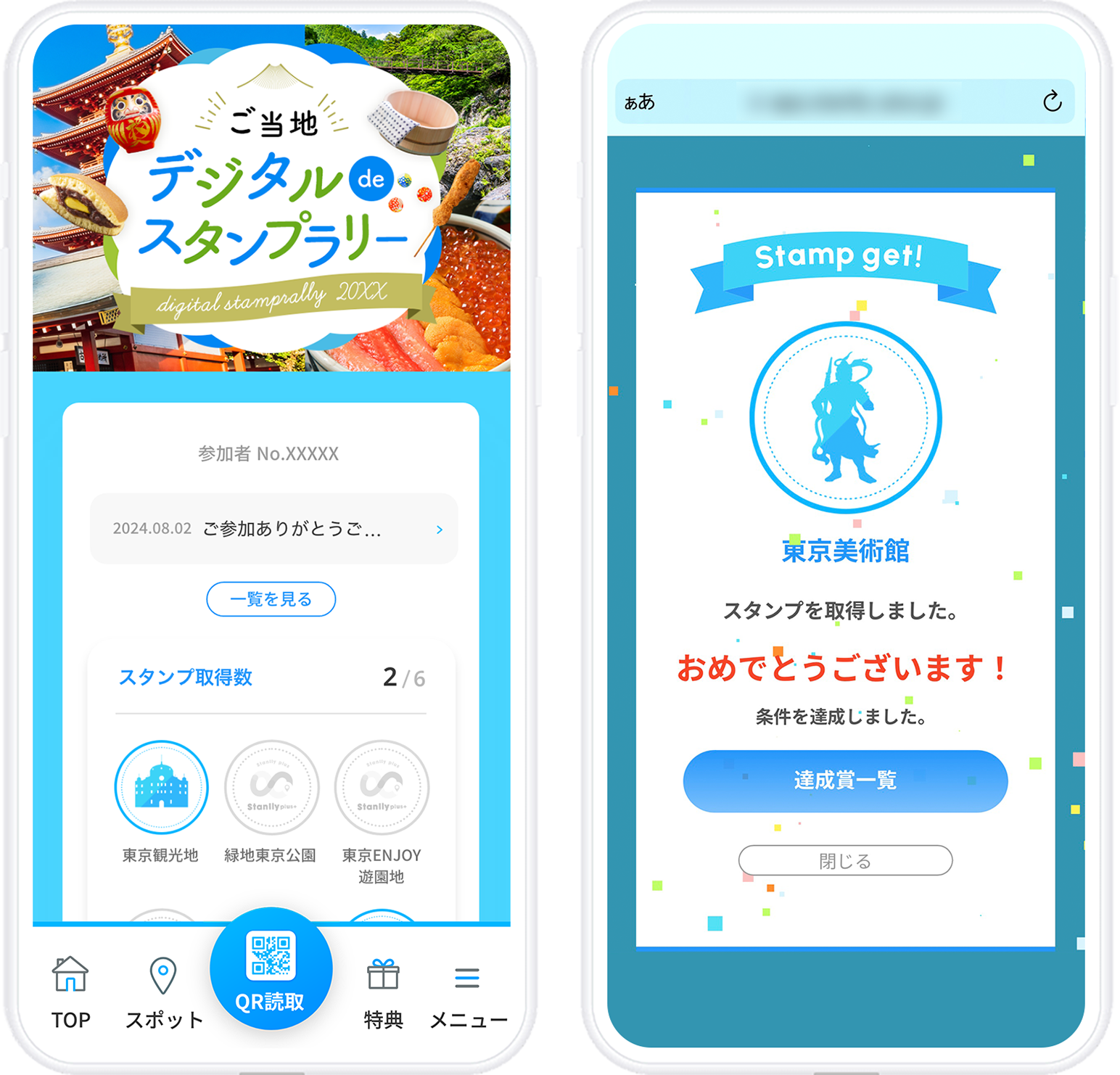 QRコード+GPS認証では、指定されたQRコードを読み取るだけでなく、位置情報の確認が必要となります。実際に現地にいる方のみがスタンプを取得できるため、不正防止対策として有効な付与方法です。